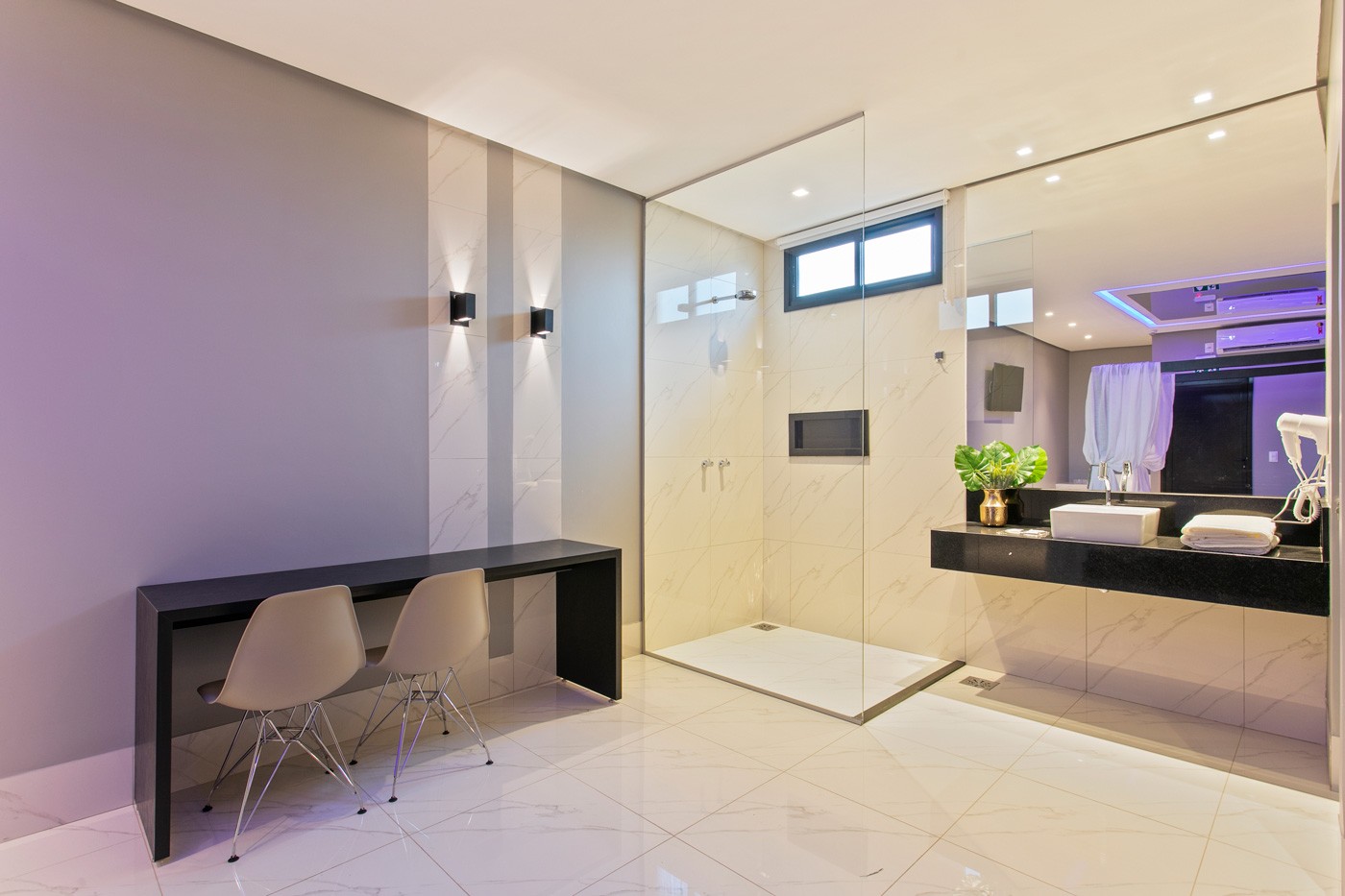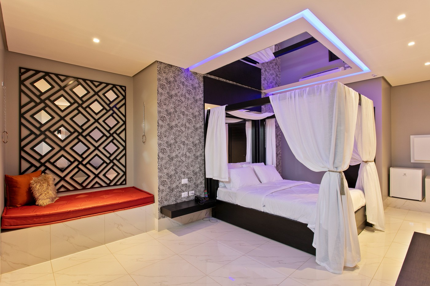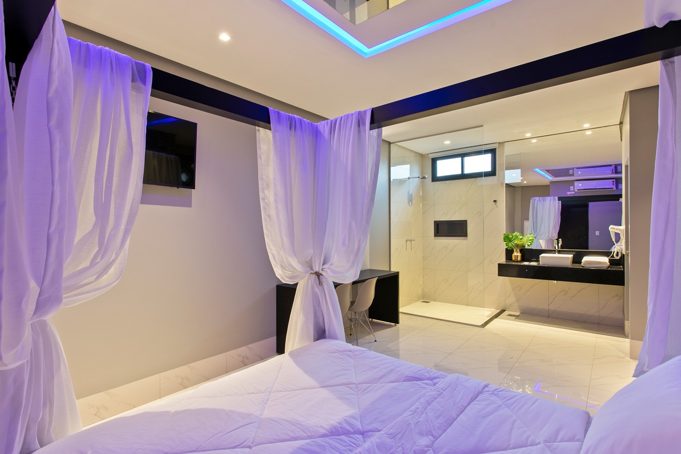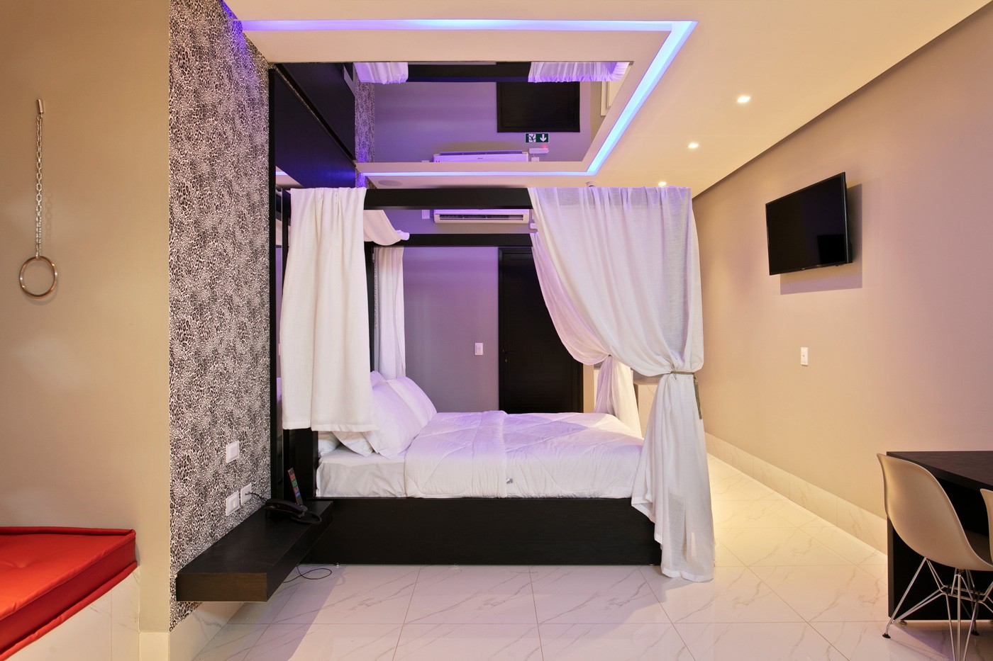 Com aconchegante cama Queen e uma decoração temática, este apartamento oferece uma experiência única. A TV Smart e o sistema de som integrado oferecem entretenimento, enquanto o frigobar mantém as bebidas sempre à mão. A cama com uma tenda, cortinas em tecido e espelho na cabeceira e teto adicionam um toque exótico e interessante ao ambiente.