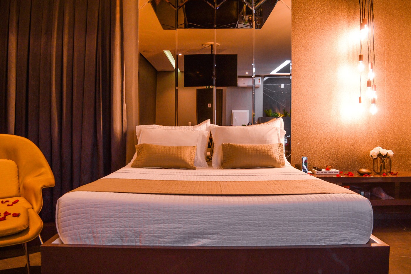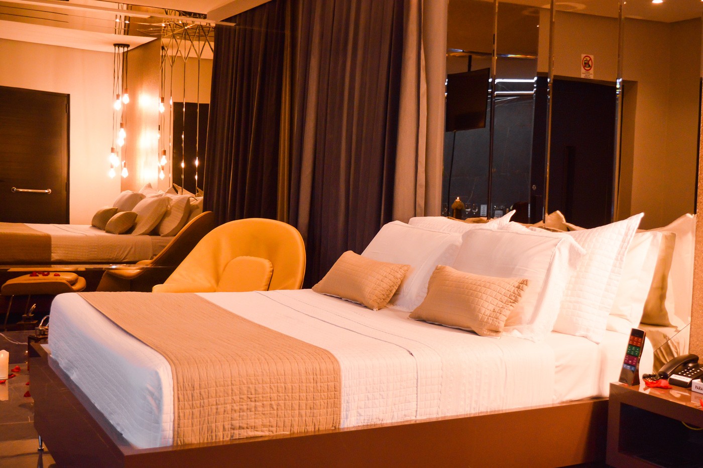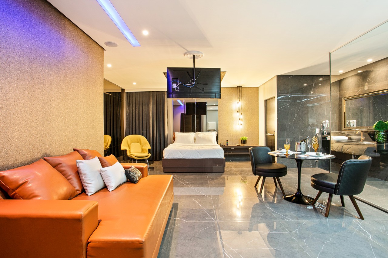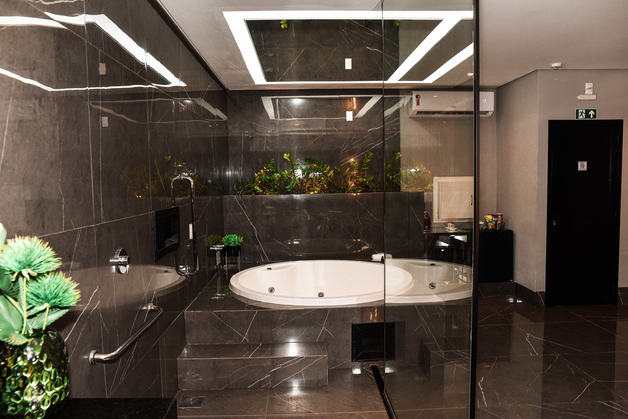 Conheça a Suíte Premium Black, uma das acomodações mais luxuosas do Estrelas! Equipada com uma cama QUEEN para uma noite perfeita e uma hidromassagem redonda, com espelho no teto, para momentos relaxantes. O quarto também possui um confortável sofa de couro, mesa de jantar, ideais para uma refeição íntima ou um momento relaxante, poltrona e uma TV Smart oferecem opções de entretenimento, enquanto um sistema de som integrado adiciona um toque extra de luxo. O frigobar esta à disposição dos hóspedes. Se procura uma suíte para momentos especiais, não poderia ter feito uma escolha melhor. Bem vindo a Suíte Premium Black.